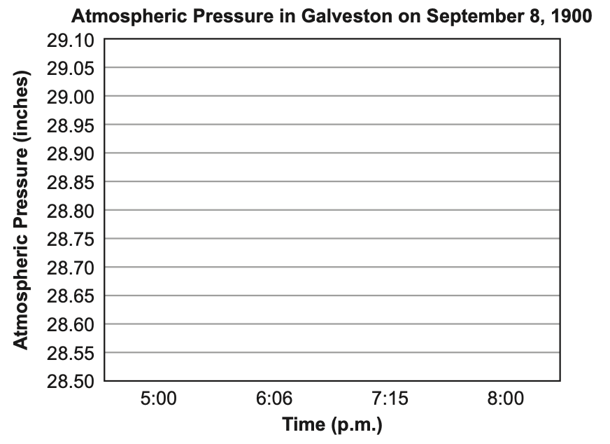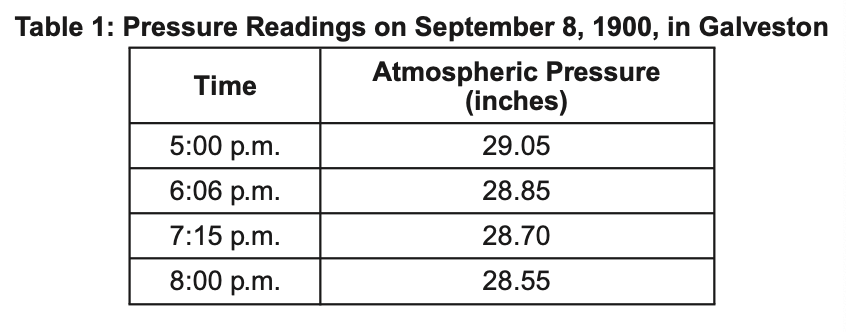 Use the information in Table 1 to create a bar graph of the atmospheric pressure in Galveston for the evening of September 8, 1900.