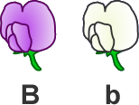 A capital B symbolizes the purple flower allele, which is dominant in pea plants. A lowercase b symbolizes the white flower allele, which is recessive in pea plants.