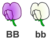 A BB genotype means a plant has two dominant alleles, so its phenotype is purple flowers. A bb genotype means a plant has two recessive alleles, so its phenotype is white flowers.
