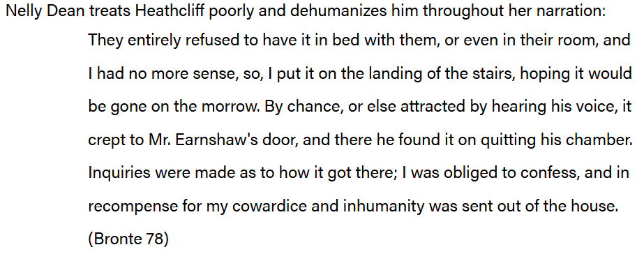 Nelly Dean treats Heathcliff poorly and dehumanizes him throughout her narration: