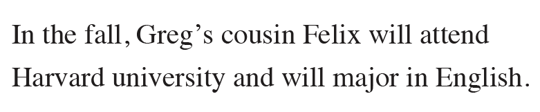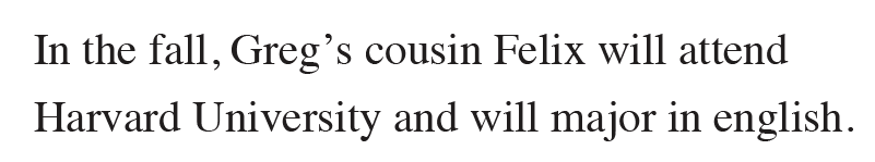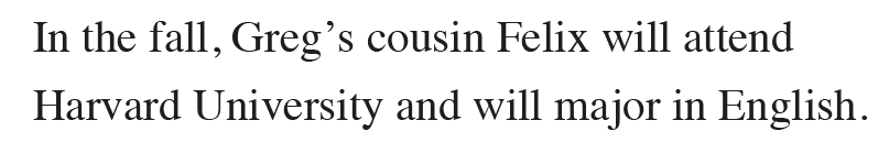 in the fall, greg’s cousin felix will attend harvard university and will major in english.