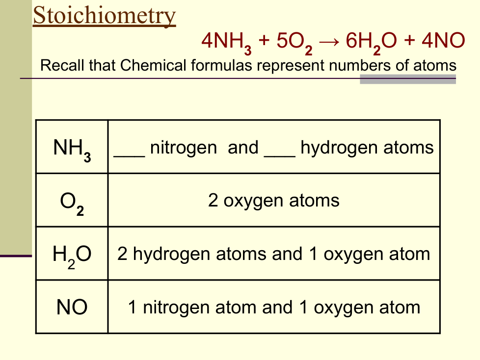 NH3 = _______ nitrogen and _______ hydrogen atoms