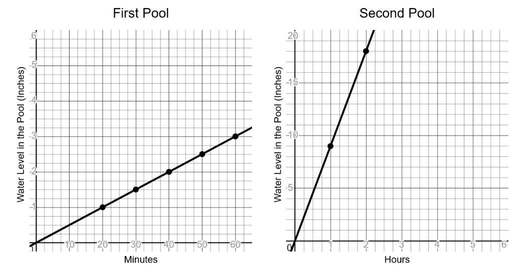 The Blue Water Company wanted to determine the rate of water flowing into two pools located in different locations on their site. They began to fill each pool with water, and then graphed the results, as shown.