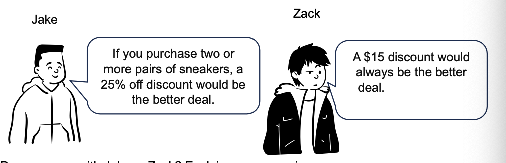 At a shoe store, a pair of sneakers is priced at $80. When would a 25% discount provide a