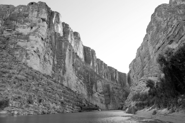 A canyon with tall, vertical sides is shown.
