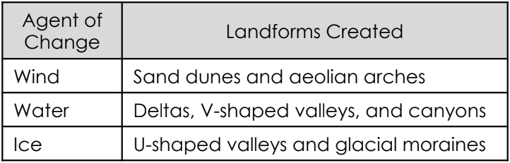 The table shows how wind, water, and ice change Earth’s surface.