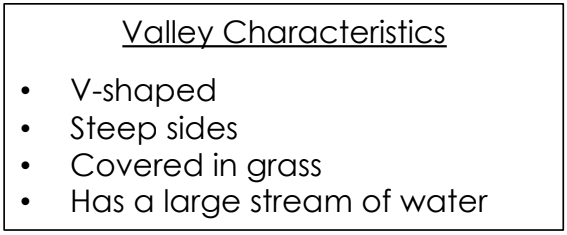 The characteristics of a valley are described.