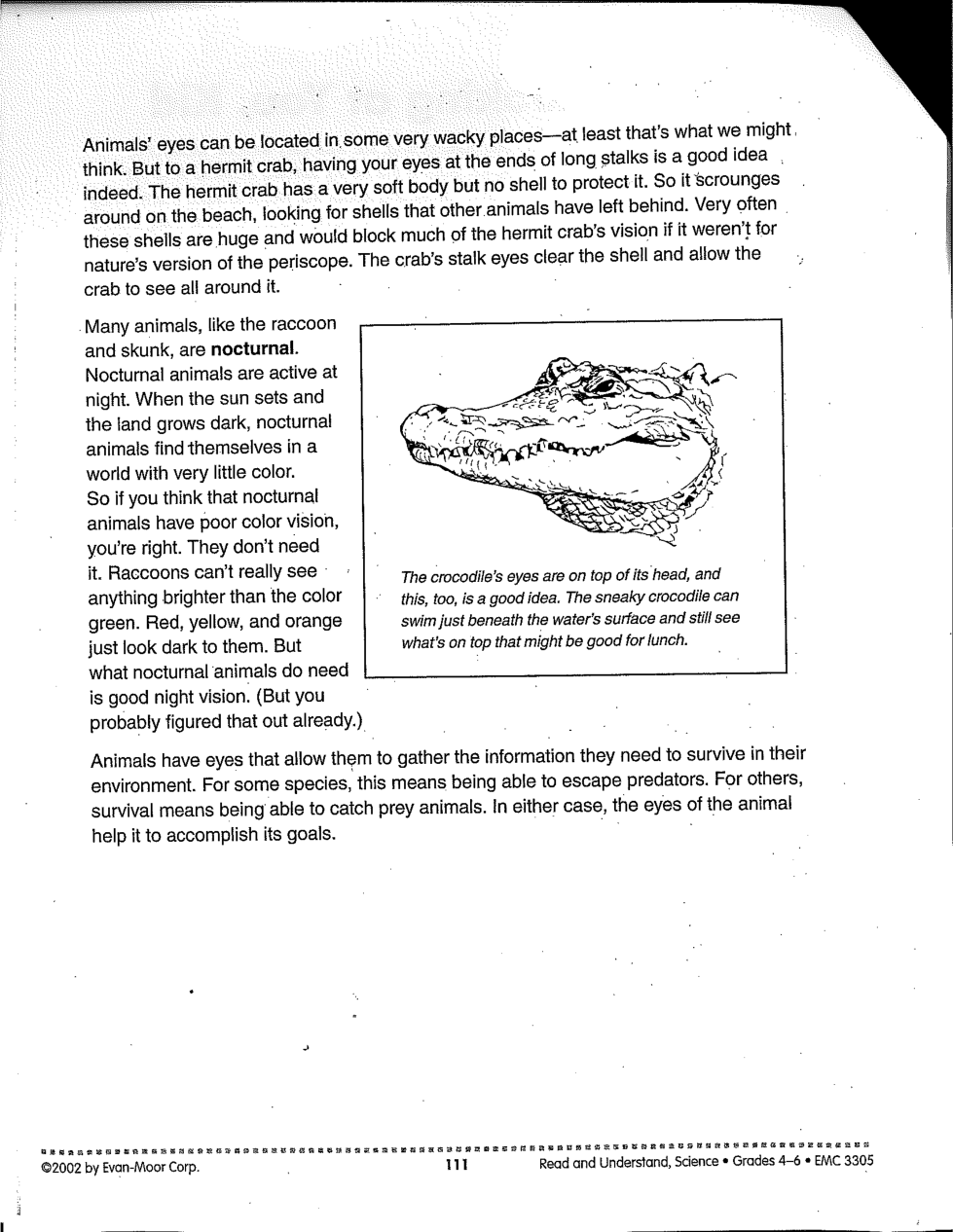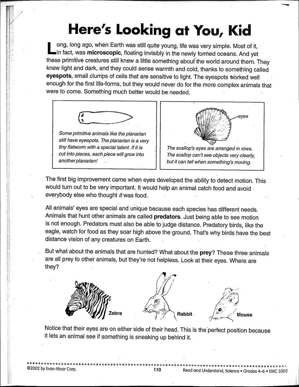Draw a water or land animal. Describe what kind of eyes the animal would have to successfully survive on Planet X-14-006. This planet receives only 6 hours of sunlight each day. Everything on the planet is underwater with one exception: a very tall mountain rises 6,000 feet from the ocean. There is life in both the ocean and on the mountain.