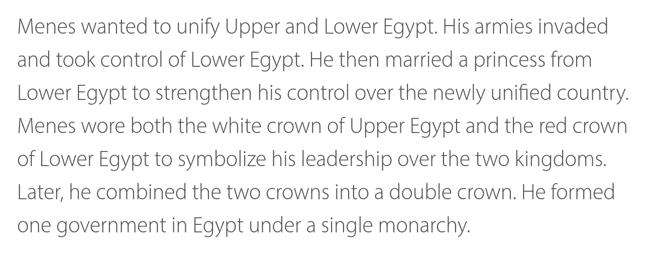 Read the text above. How did Menes (also called Narmer) unify Egypt into one civilization? (In your own words)