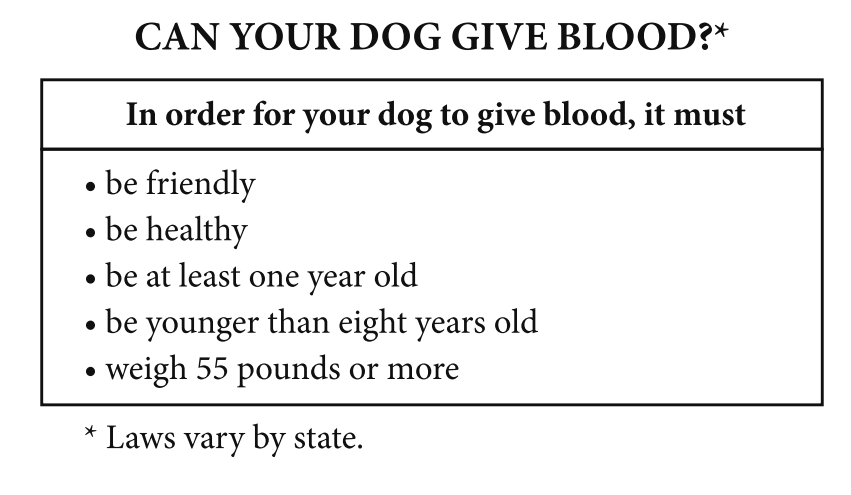 3 Like humans, not every dog is eligible to donate blood. The pooches are screened for health first. Dogs must have the correct blood type, weigh at least 55 pounds and be younger than 8 years old. About 150 dogs participate in the program. Each donates three or four pints a year, which can help animals suffering from illnesses like cancer or an accidental trauma like being hit by a car. One pint can save up to three dogs.
