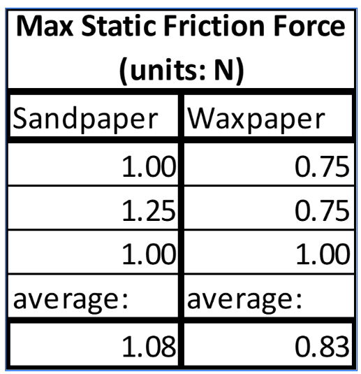 A wooden block is pulled on two different surfaces: sandpaper then wax paper. The maximum force of static friction between the block and each surface was recorded for three trials in the table shown.