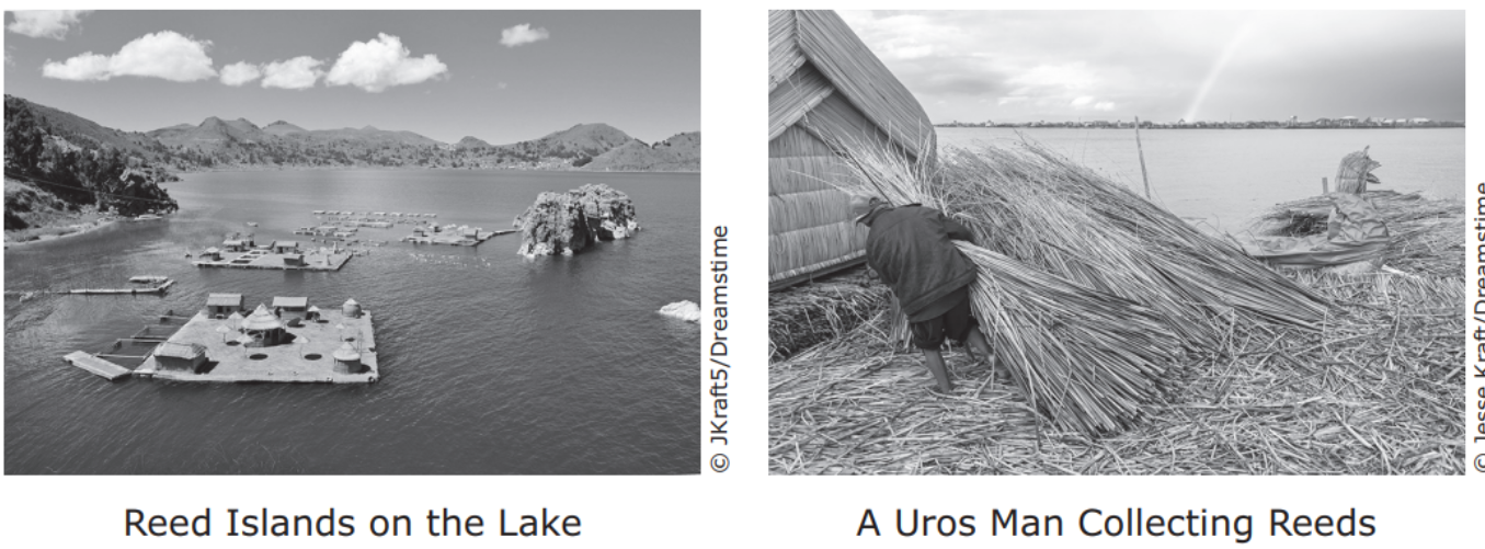 (5) The Uros people have florished on these islands for thousands of years. (6) An indigenous tribe, the Uros created the floating reed islands as a refuge for themselves from neighboring tribes. (7) In building the “giant lily pads,” the people used the plentiful totora reeds that grow along the nearby marsh. (8) The reeds not only provide the material for the floating islands but also for the people’s huts and homes.