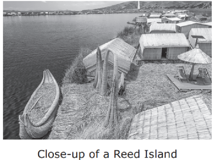 (1) On South America’s Lake Titicaca, the night sky glitters with stars that seem close enough to touch. (2) Majestic mountains canvas the background, and no city buildings or street lights interfere with the view. (3) However, there are people who live here in a unique little town. (4) The town, a cluster of man-made, floating islands, sits on the lake itself.