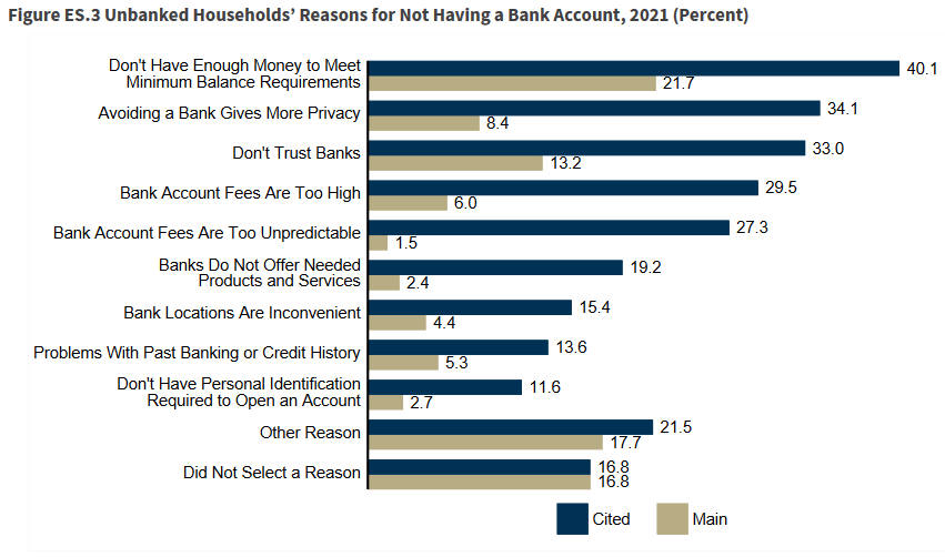 Being unbanked is expensive, yet millions of Americans do not have bank accounts and regularly rely on alternative financial services, like check cashers. Analyze this graph to learn more about the reasons why people are unbanked.