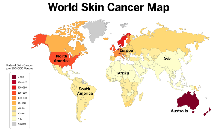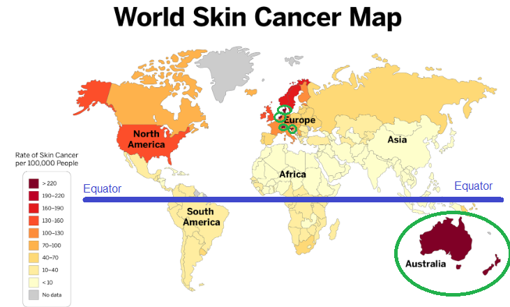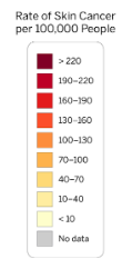 Draw a circle around the areas with the highest rate of skin cancers