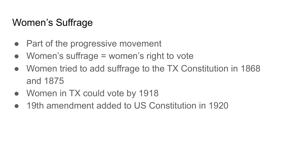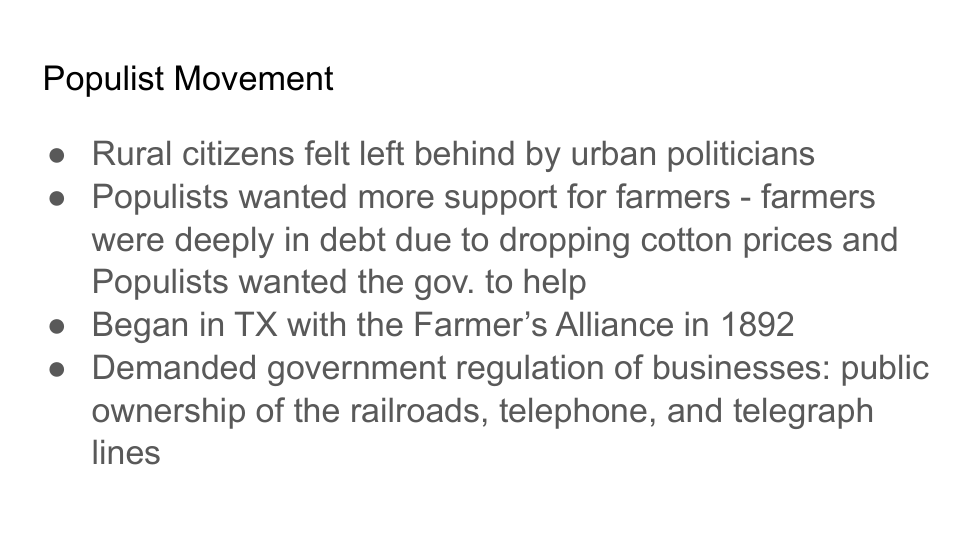 Exit ticket: Which reform movement do you believe was the most important to the average Texan? Justify your answer using evidence from the notes, readings, and/or videos.