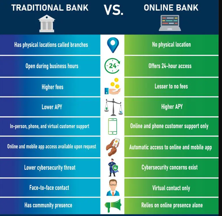 Compare traditional and online banks by listing at least one pro and one con of each type of bank