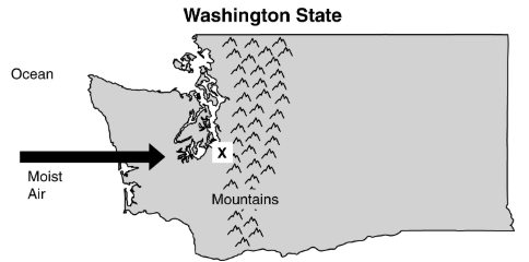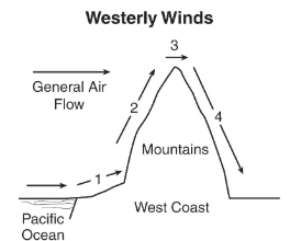 The westerly winds bring moisture from the Pacific Ocean to the west coast of the United States as shown. At which point in this diagram would the least rainfall occur?