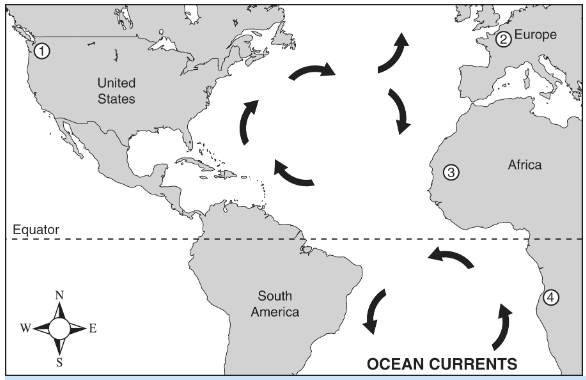 Which point on the map has a colder climate because of the proximity to an ocean current?
