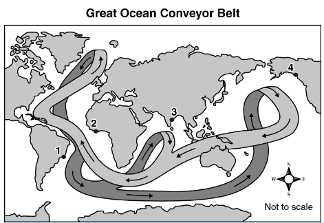 Ocean currents distribute heat energy over the surface of Earth. The map illustrates a major pattern of water circulation in the oceans.