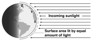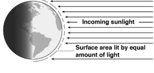 The arrows in the diagram below show how the Sun’s rays hit Earth. Each part of the dashed line shows an area lit by an equal amount of sunlight.