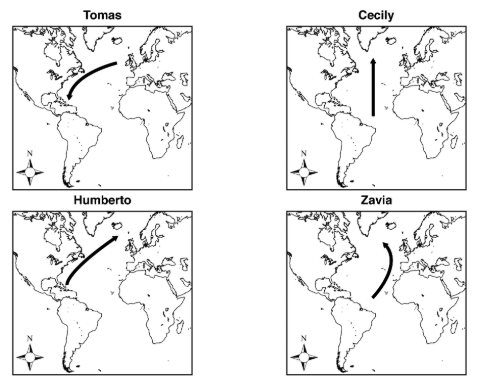 Mrs. Anderson gave her class a quiz about the Gulf Stream. The first question asked students to draw the path of the current. Four of the maps are below.