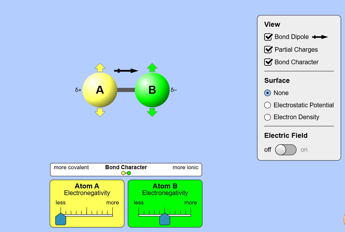 Set the electronegativity to the approximate settings in the picture. Draw in the bond dipole and show the partial charges.