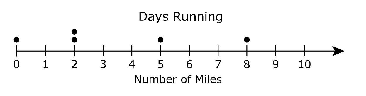 The dot plot shows the numbers of miles Joseph ran on five days. Joseph ran on one more day, but the dot is missing from the dot plot.