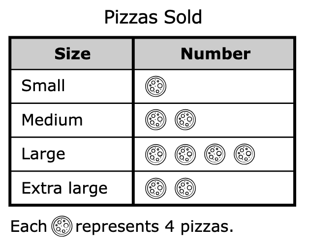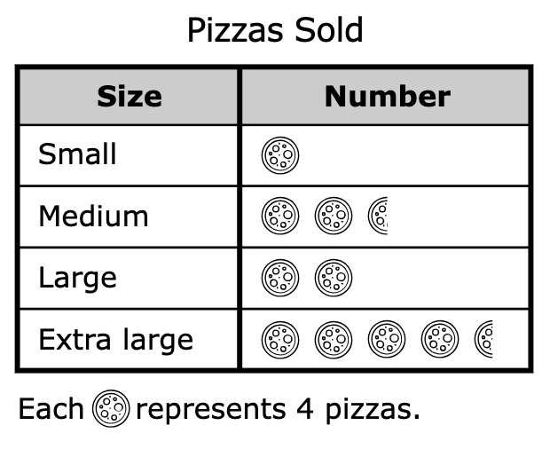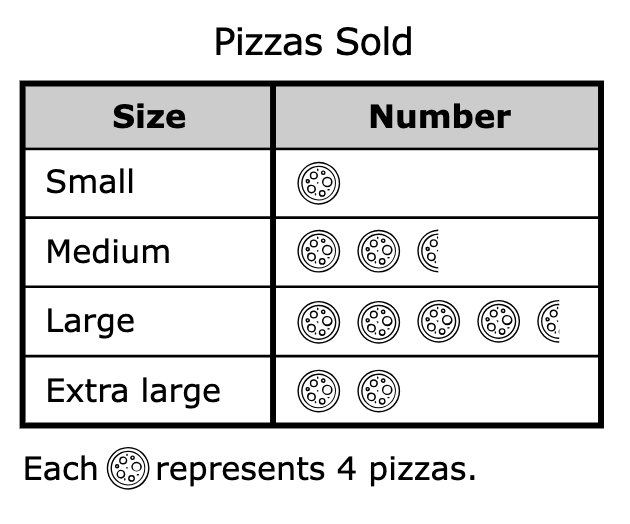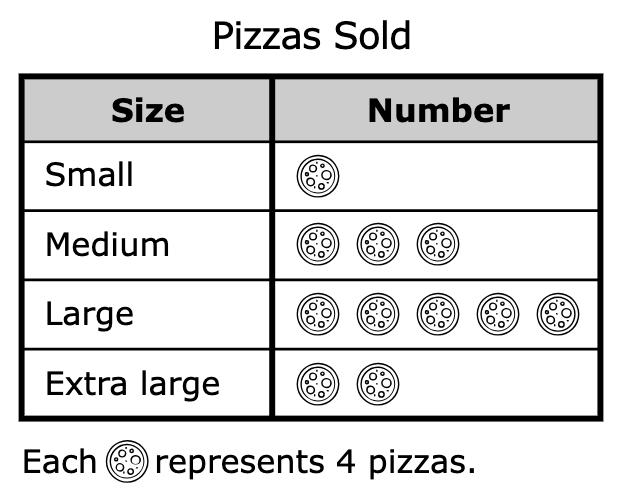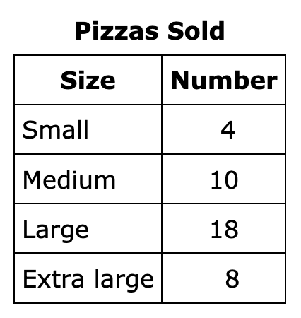 A restaurant sells four sizes of pizza. The table shows the pizzas sold.