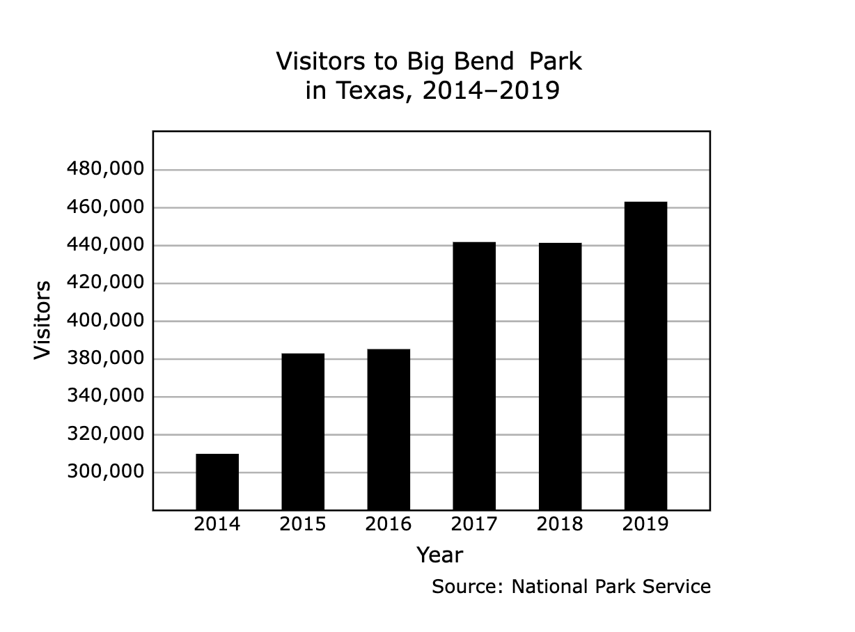 (2) More and more people are visiting parks each year. For example, Big Bend National Park had 314,102 visitors in 2014. By 2019, the number went up to 463,832 visitors. Sometimes, the government that owns a park might spend money to build things for the people who visit. This can include playgrounds, picnic areas, and gift shops. But crowds at parks can affect the plants and animals that live there. Building things to attract more people can make the problem worse. Instead, governments should spend more money to protect the nature in parks.