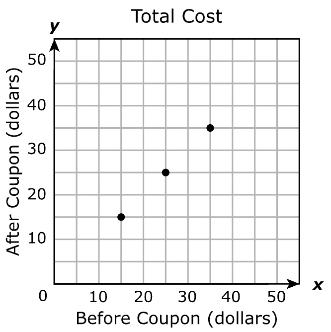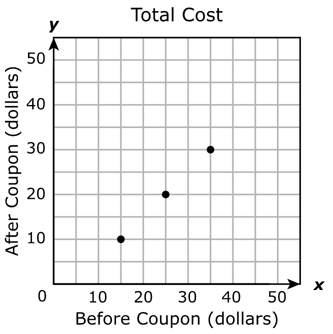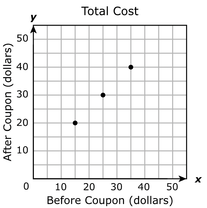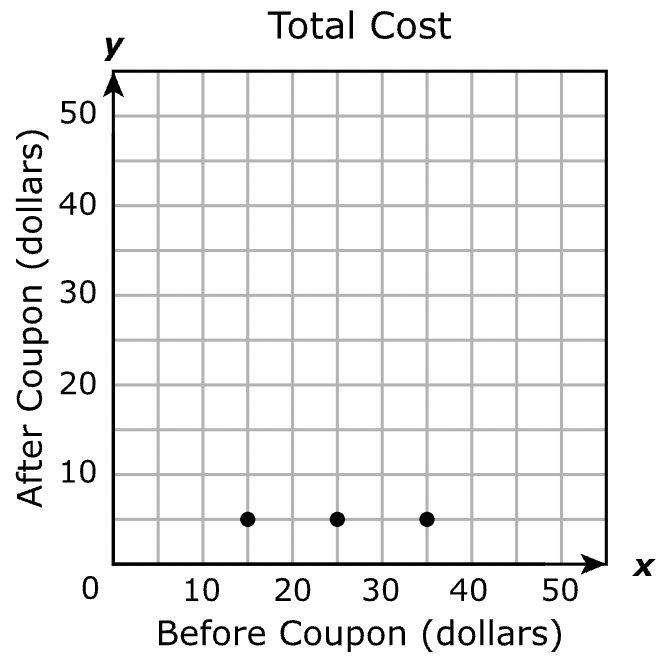 Which graph could best represent the total cost for each customer before using the coupon, x, and after using the coupon, y?