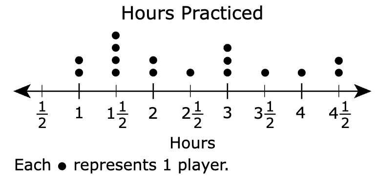 The players on a basketball team record the number of hours they each practice in one week. The data are shown in the dot plot.
