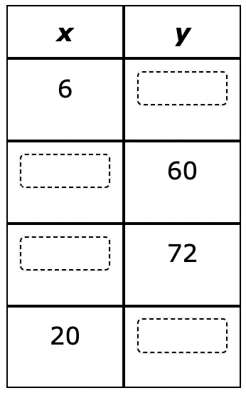 The values in the table represent the equation y=6x. Complete the table to represent the relationship between the values of x and y.
