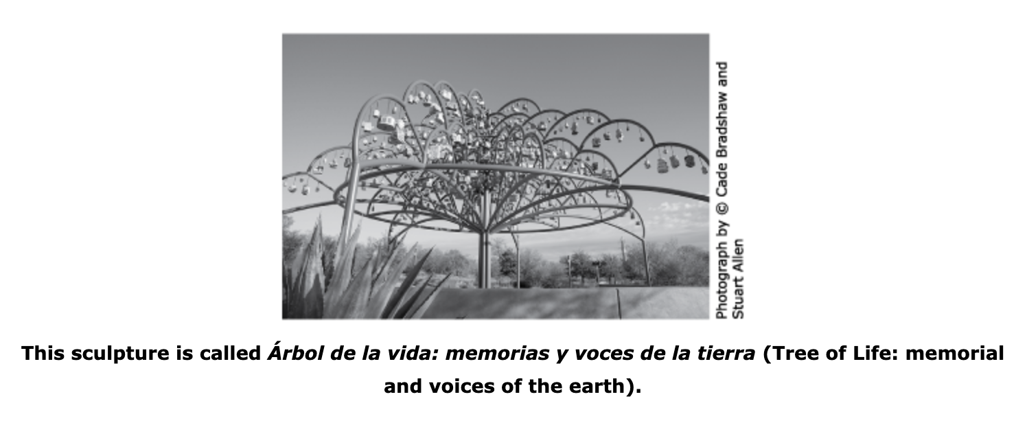 (1) Along the path to Mission Espada, a San Antonio mission nestled near the river, stands a magnificent tree unlike any other. This is not a tree made of wood and leaf. It's a tree created with steel and clay. The enormous man-made tree stands 40 feet tall and 80 feet wide. Its branches are curved poles that wind and connect to form a supporting structure for the true focal point. Hundreds of heavy clay sculptures dangle like ornaments from these branches. The stunning monument arouses the curiosity of its many visitors. What is this tree and where did it come from? It is an árbol de la vida—a tree of life.