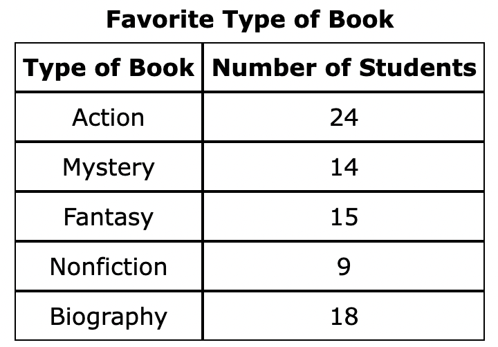 A school librarian surveyed 80 randomly selected students about their favorite type of book. The results are shown in the table.