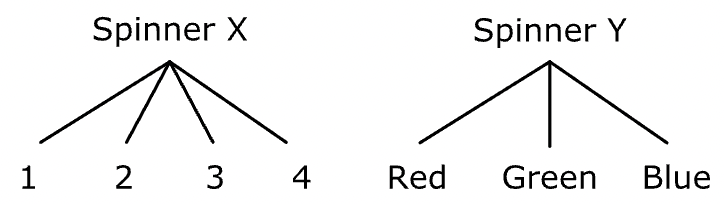Spinner X is divided into 4 equal sections, and Spinner Y is divided into 3 equal sections. The possible outcomes for each spinner are shown in the tree diagrams.