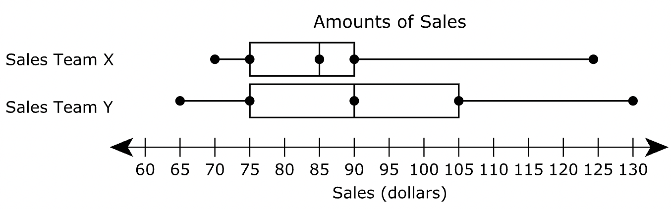 A company divided its salespeople into two teams and recorded the amount of each employee's sales in dollars for a week. The box plots display the results.