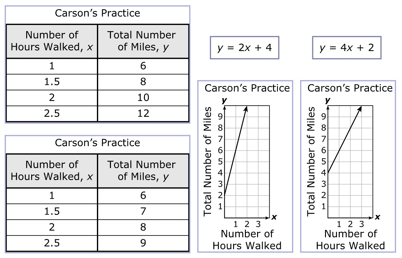 Which representations show the relationship between the total number of miles he covers in a day, y, and the number of hours he walks, x?