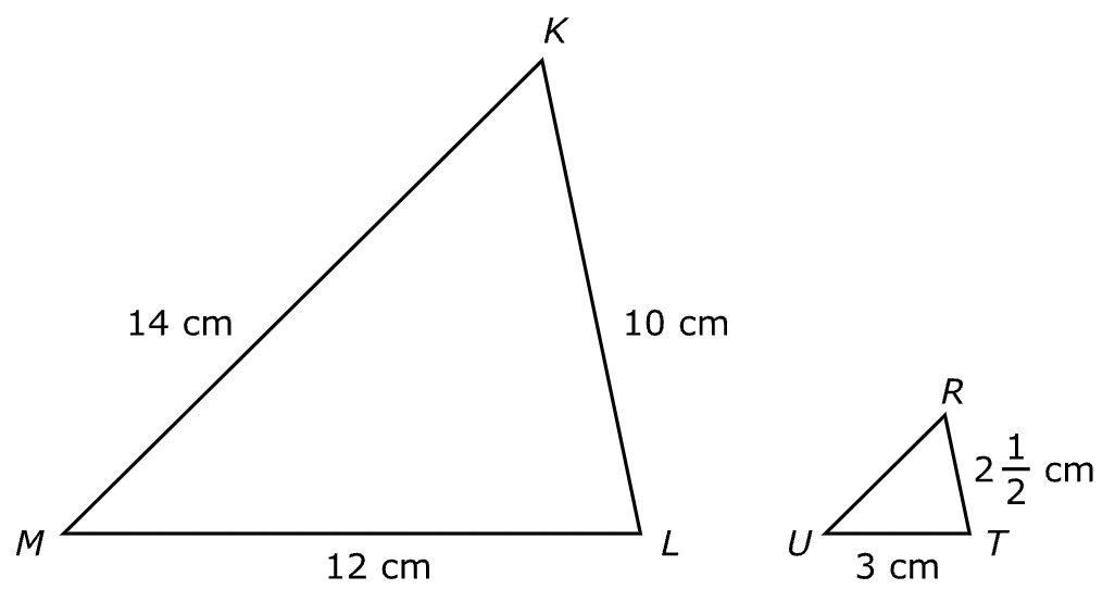 Triangle KLM is similar to triangle RTU. The triangles are shown with side lengths in centimeters.