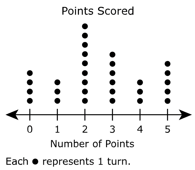 The dot plot shows the number of points a player scored in each of 30 turns in a game.