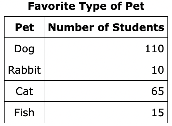 A survey was given to 200 students about their favorite type of pet. The survey results are shown int he table.