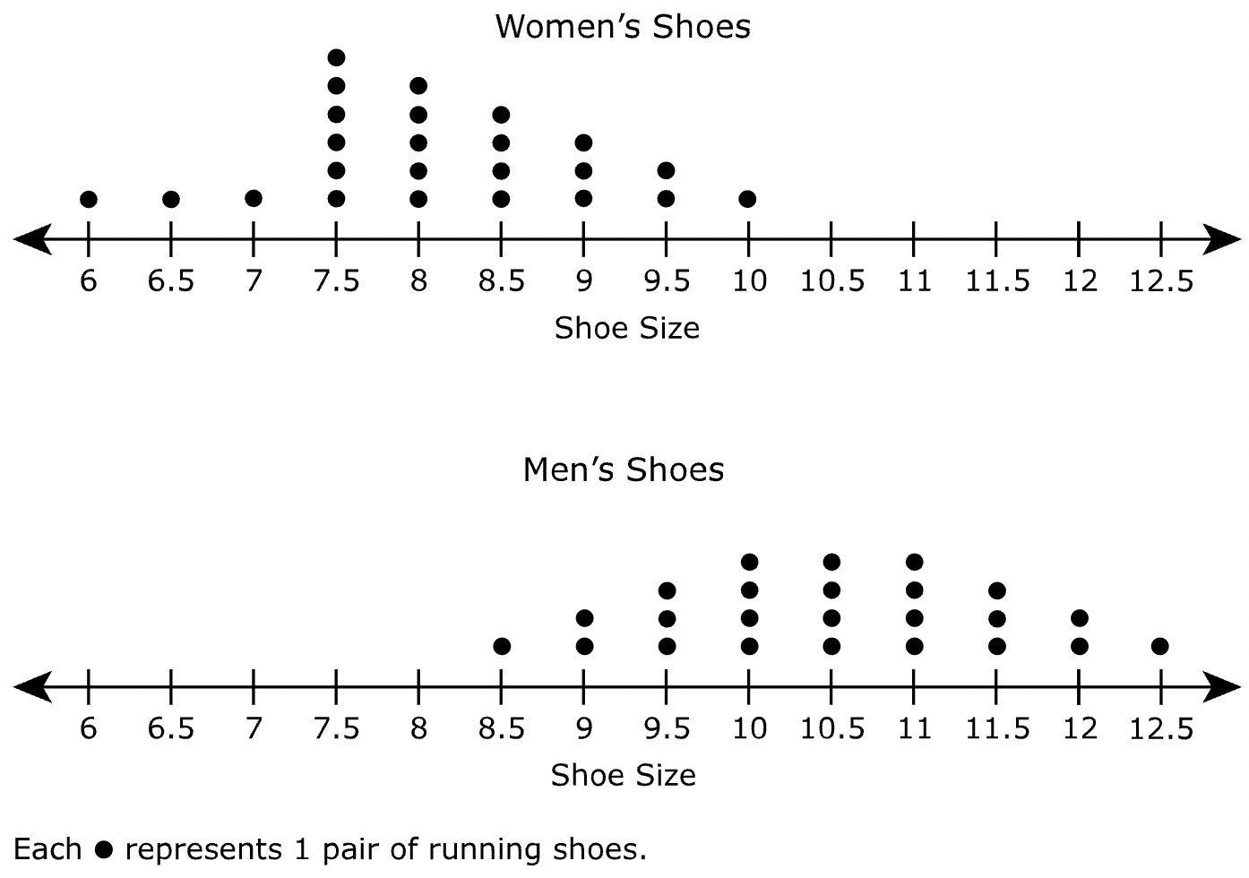 A shoe store manager ordered various sizes of running shoes. The dot plots show the sizes of women's shoes and men's shoes that the manager ordered.