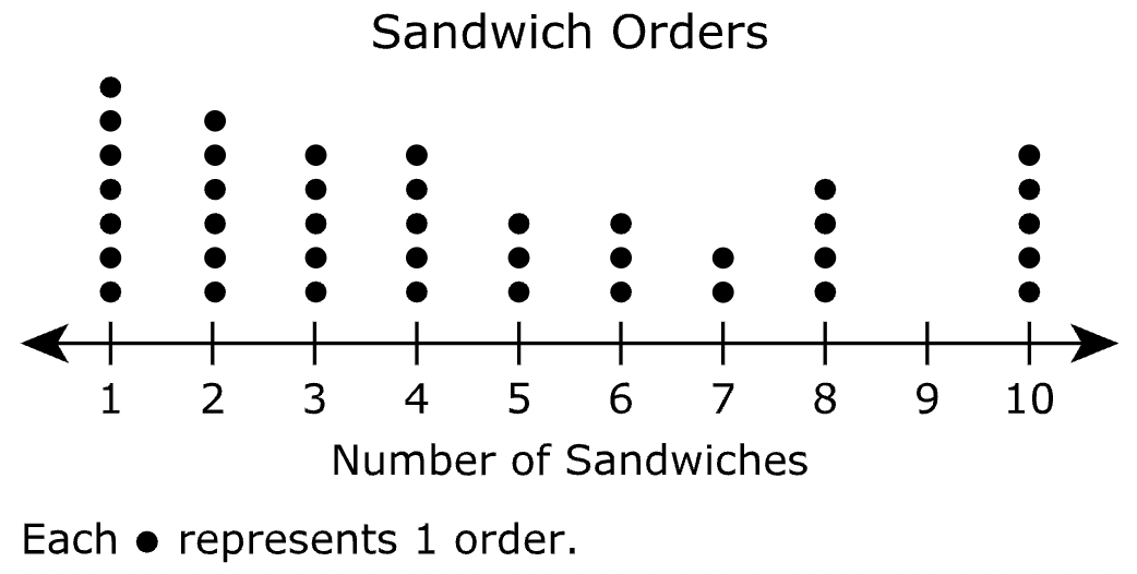 The owner of a deli recorded the number of sandwiches in each order for a random sample of orders that were placed on Monday. The data are presented in the dot plot.