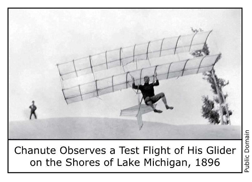 (8) Chanute agreed. Between 1896-1898, he worked on glider designs. With the help of assistants, he made hundreds of flight tests on the windswept sand dunes at the foot of Lake Michigan. He would say later, "I learned more in two weeks of practical experimentation than I did in years of research and study."