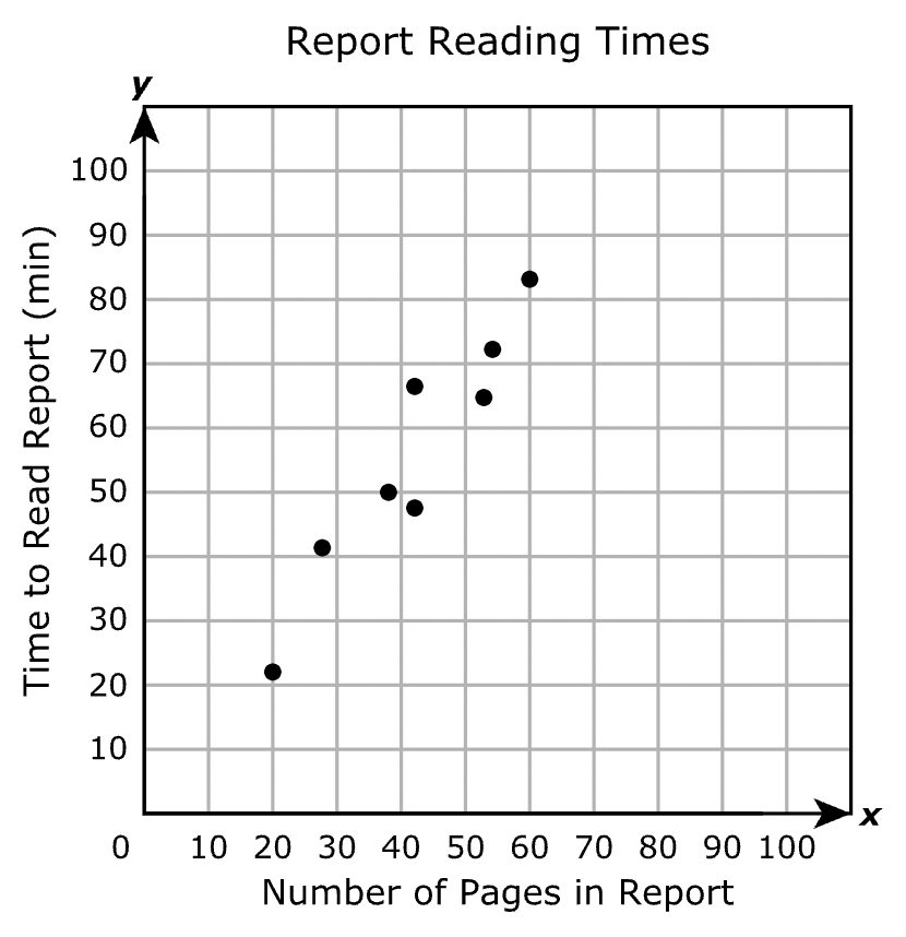 A company employee had to read several financial reports. The scatterplot shows the lengths and reading times for those reports.