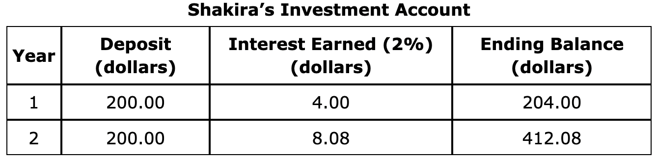 Shakira has an investment account that she deposits $200.00 into each year. The table shows the amount of interest she earns in dollars and the ending balance each year.