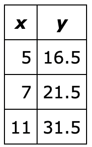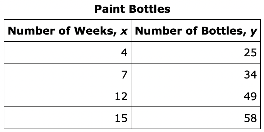 An artist started with some paint bottles. The artist buys the same number of additional bottles each week. The table shows the linear relationship between x, the number of weeks, and y, the number of bottles that the artist has.