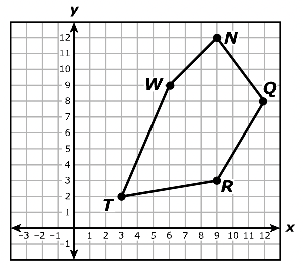 Pentagon NQRTW was dilated with the origin as the center to create pentagon N'Q'R'T'W'. Vertex R' is located at (6, 2).