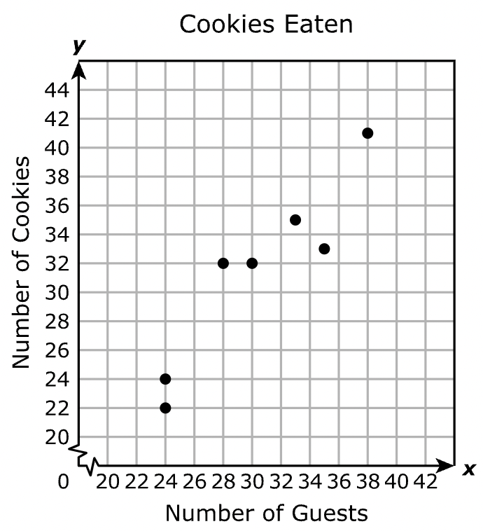 A catering company recorded the total number of cookies that were eaten at events with different numbers of guests. The scatterplot shows the results.