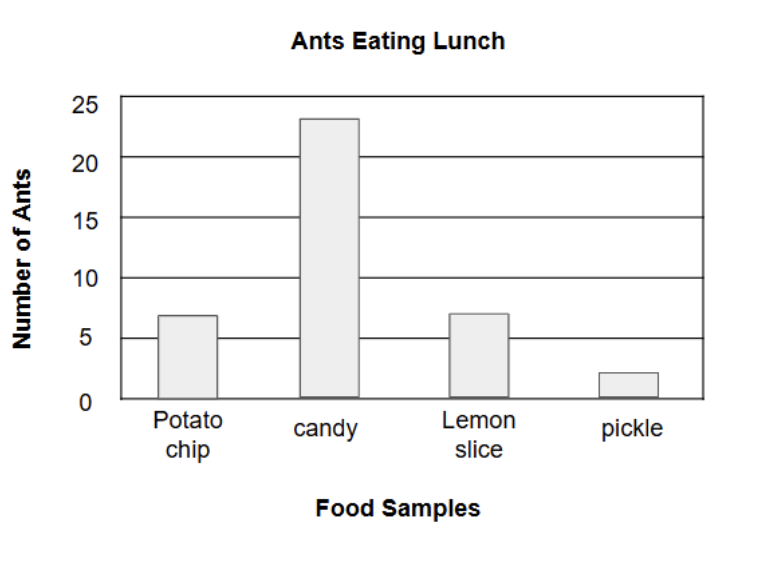 A student observed over 4 days at lunch the number of ants that visited different foods she placed on the sidewalk. She recorded the data in her notebook and created a bar graph.